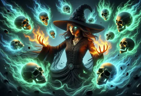 触发词:"skelewitch, a witch, casting spell, surrounded by flame-formed skulls and skeletons, ethereal aura, energy flow"