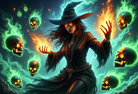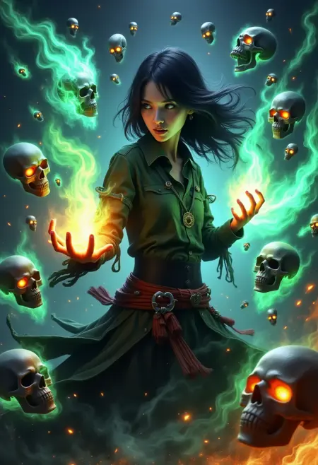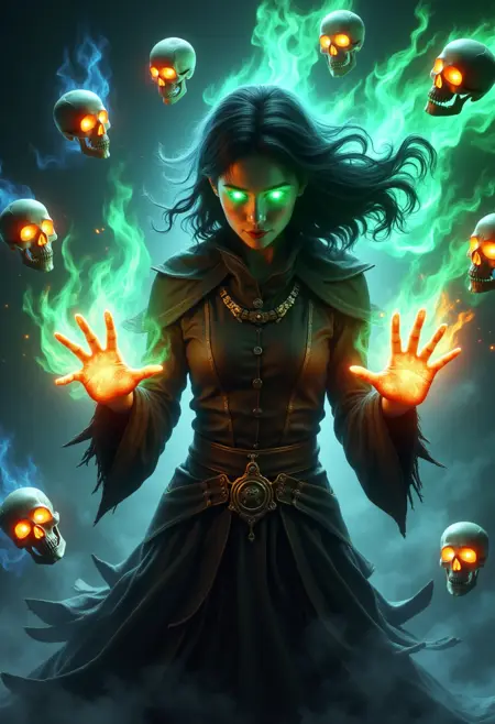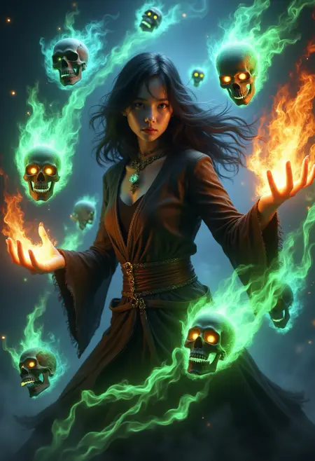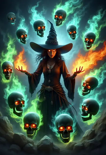 触发词:"skelewitch, a witch, casting spell, surrounded by flame-formed skulls and skeletons, ethereal aura, energy flow"