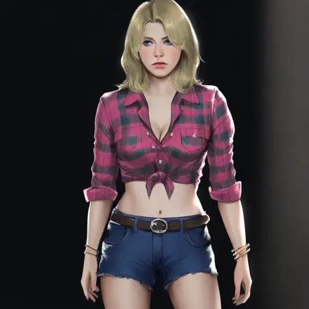 • 格子衬衫,系扣衬衫,袖子卷起,露出腰部,牛仔短裤,腰带,手链,牛仔靴