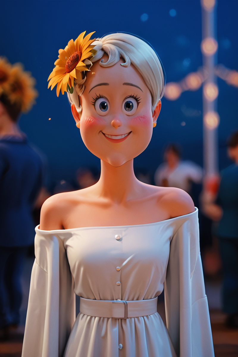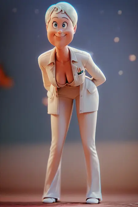 Ericka is a tall, slim and attractive fair-skinned woman with a pear-shaped figure, light blue eyes with long eyelashes, and curly, straight platinum-blonde pixie cut-styled hair. She also wore light purple eyeshadow and magenta lipstick.