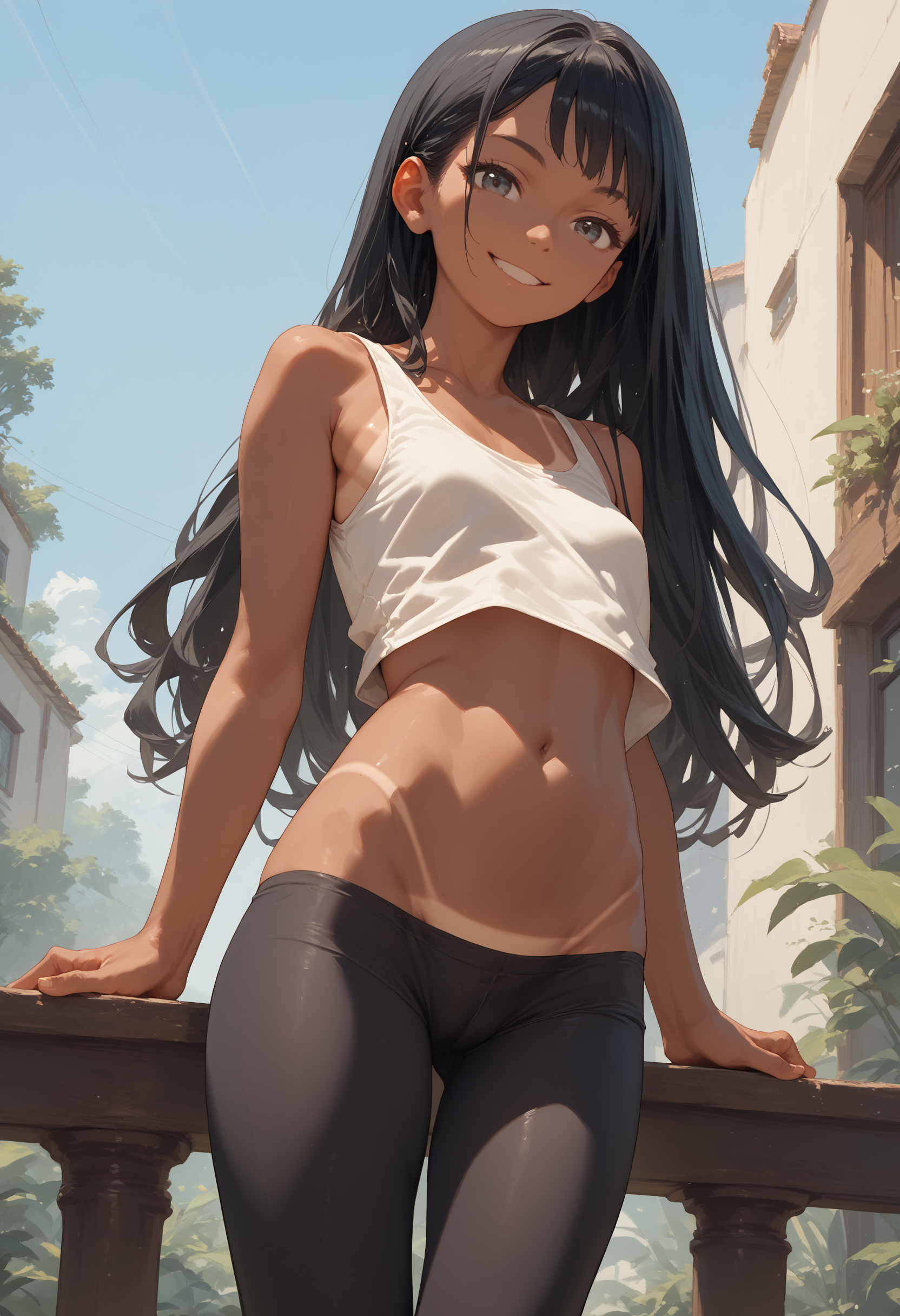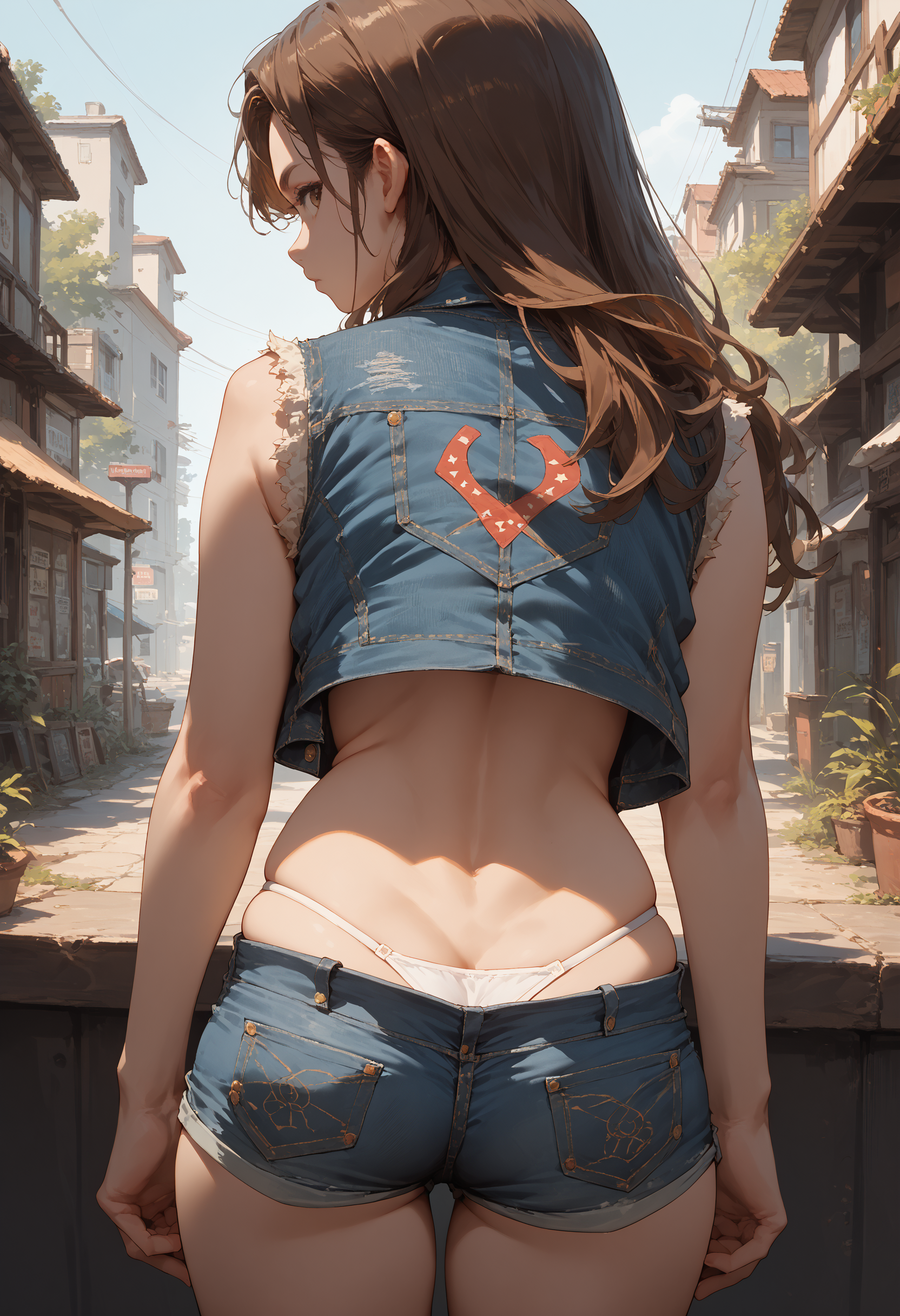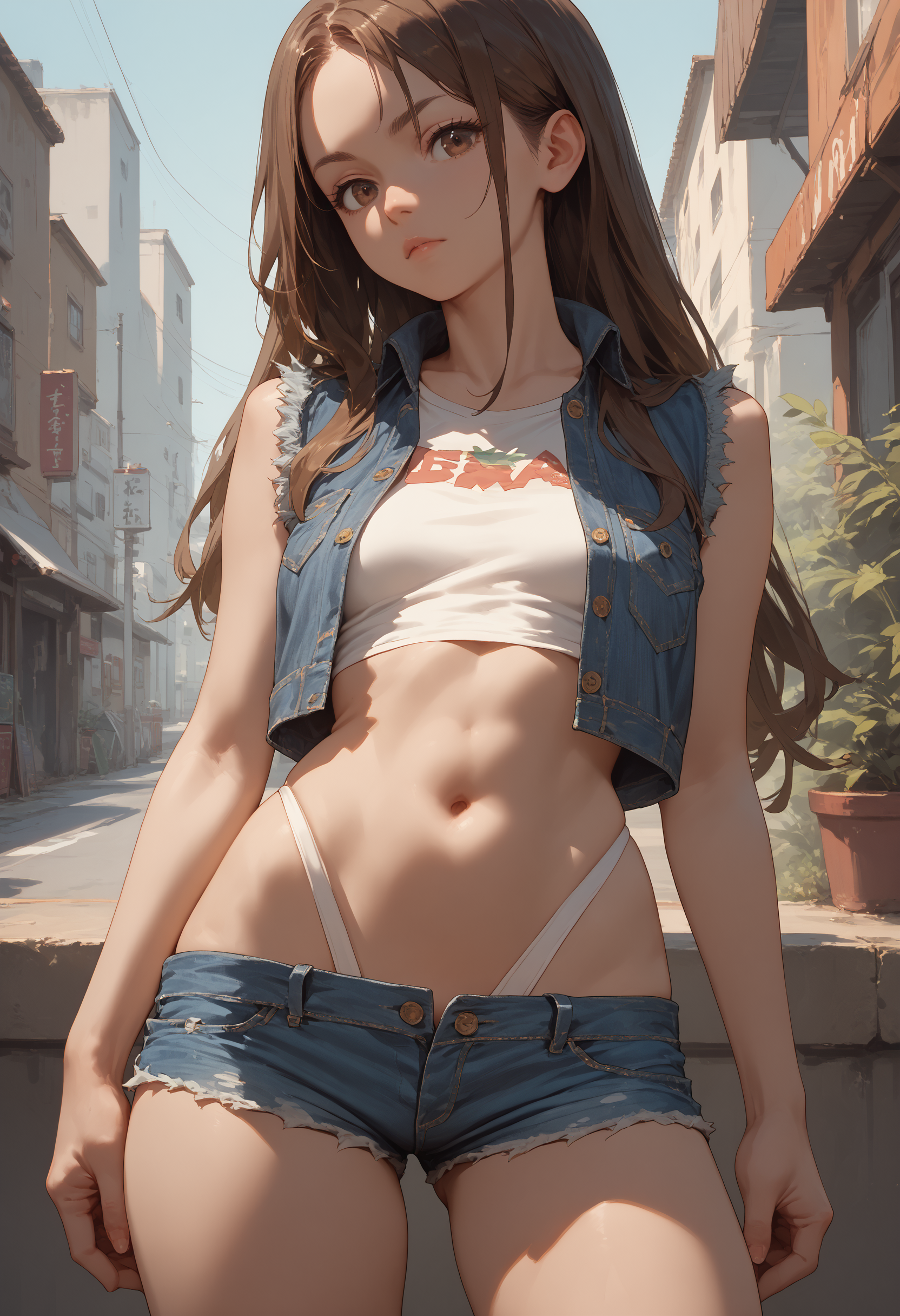 パンツやショートパンツの場合、効果を高めるために「no panties」タグを使用できます。効果をさらに強調する必要がある場合は、「midriff」タグを追加してください。