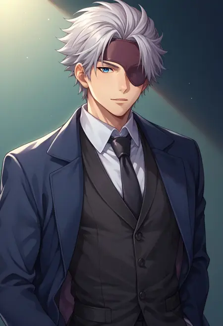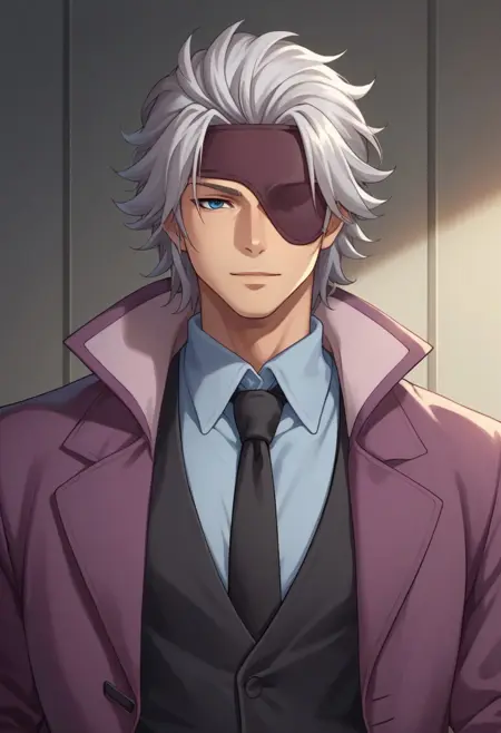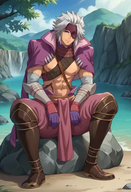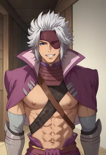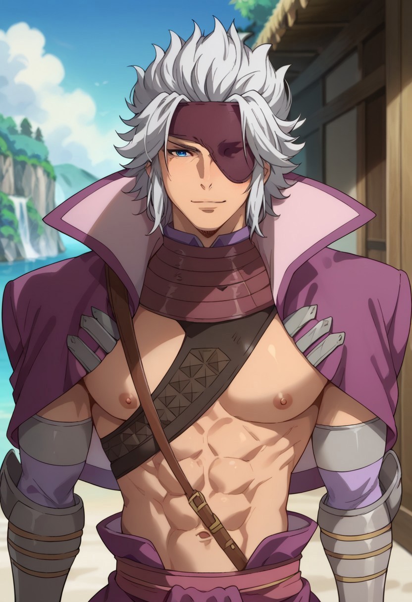 Motochika, 1boy, male focus, solo, grey hair, short hair, blue eyes, eyepatch, jacket, purple jacket, jacket over shoulders, arm armor, gloves, abs, belt, shoulder belt, pants, boots, knee boots, brown footwear,