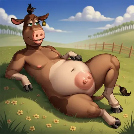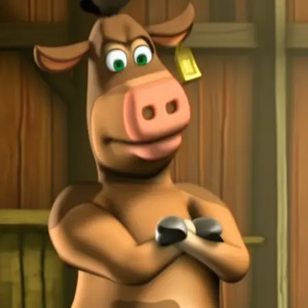 Bessie the cow (barnyard), female, brown skin, cow, brown hair, green eyes,
