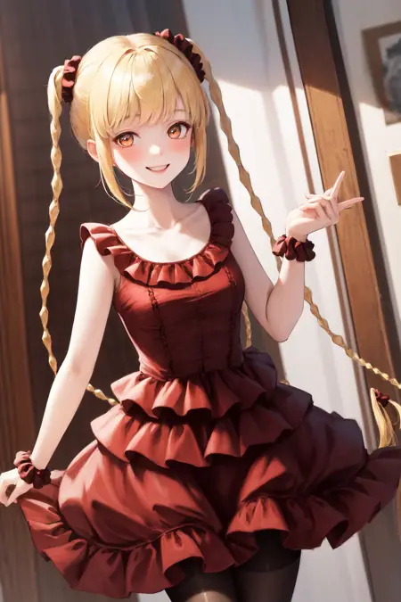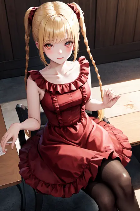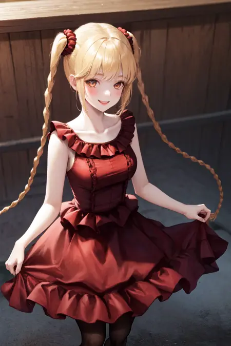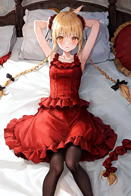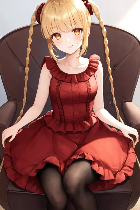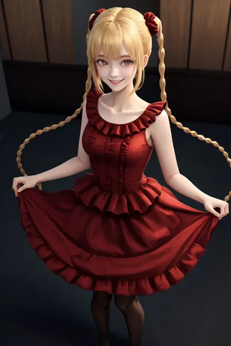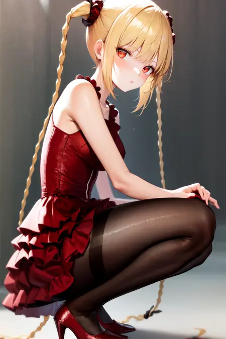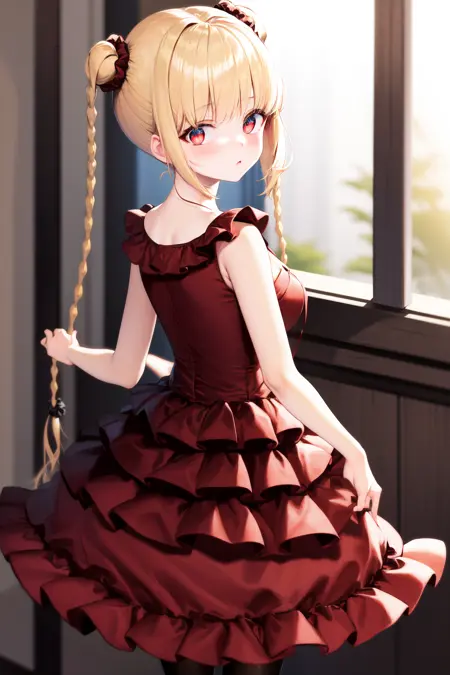 기본 옷차림: red scrunchie collarbone red dress sleeveless frilled dress pantyhose