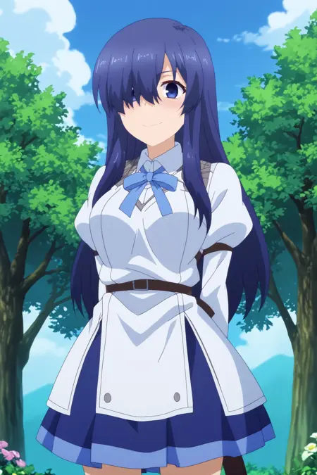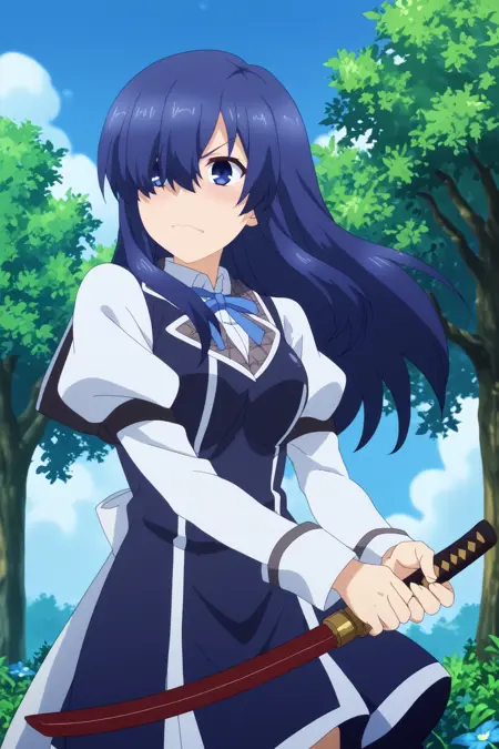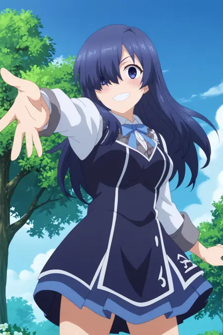 触发词:ayase ayatsuji,1girl,solo,long hair,breasts,school uniform,skirt,hair over one eye,purple eyes,blue hair,long sleeves,nanamori school uniform