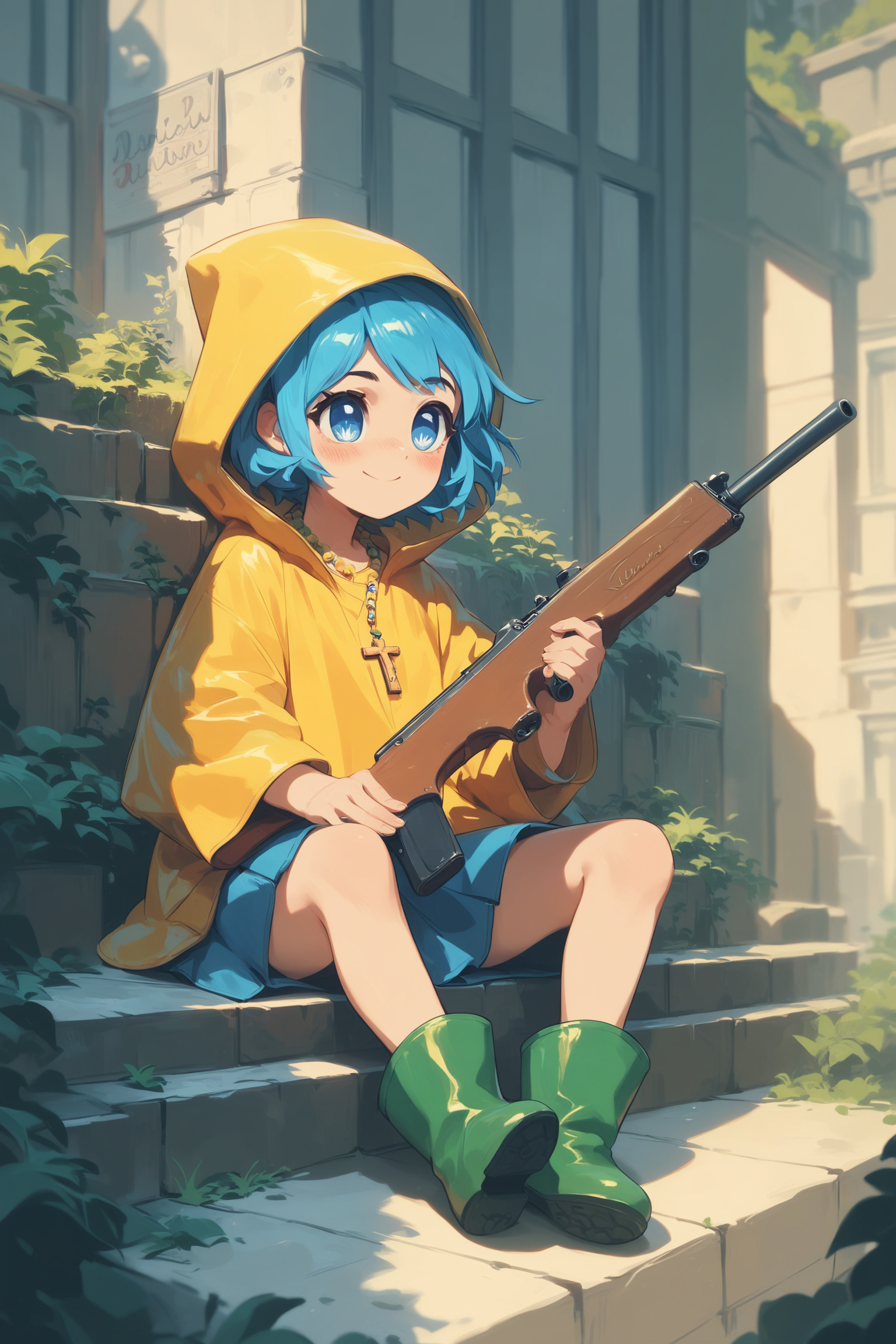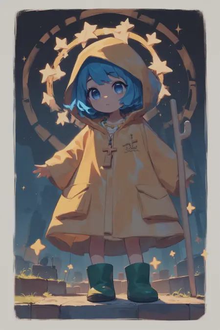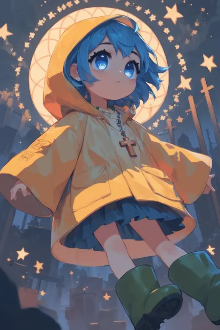 luce, 1girl, solo, cute girl, short blue hair, blue eyes, boots, signature, yellow hood, colored necklace, cross,