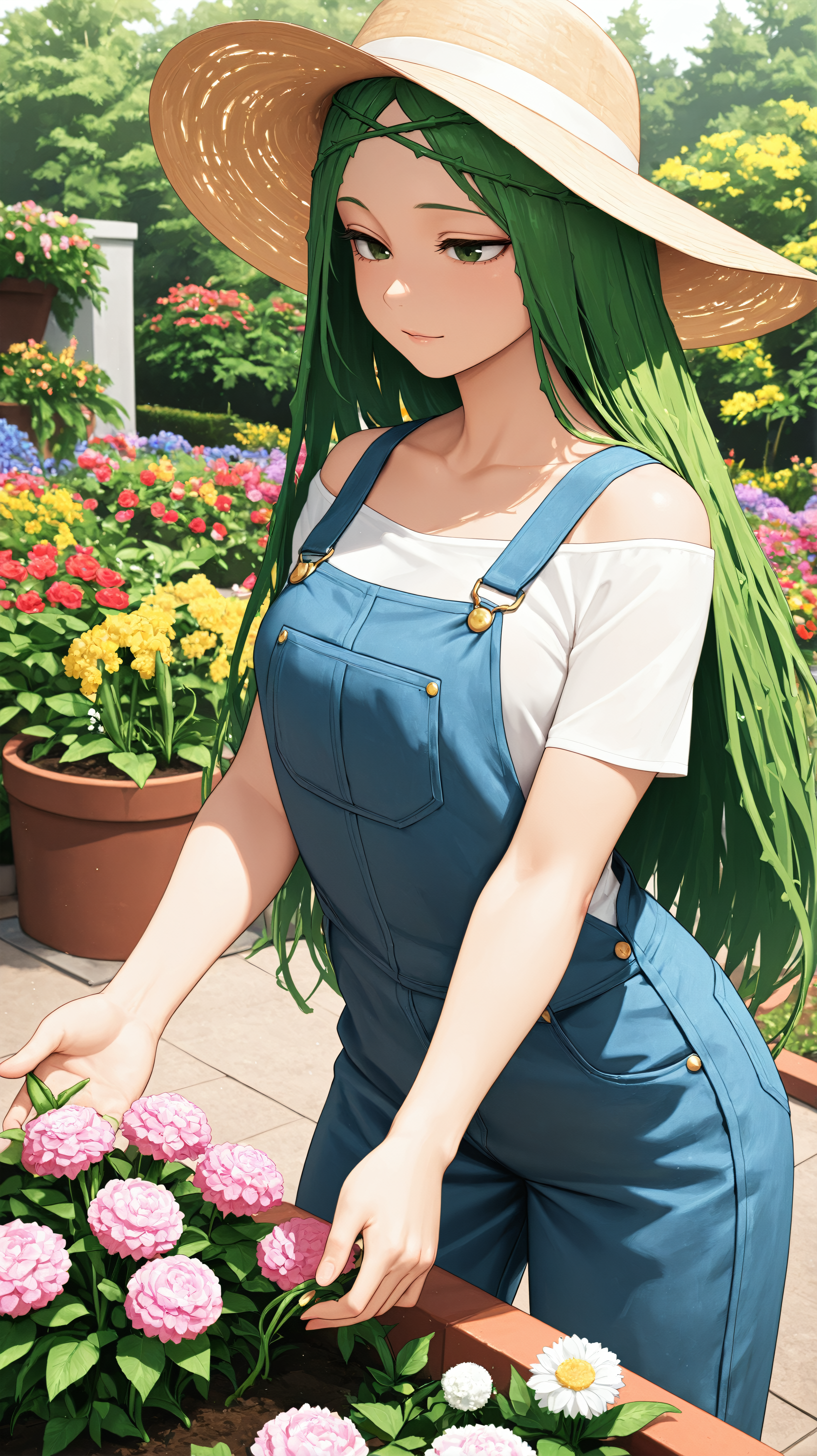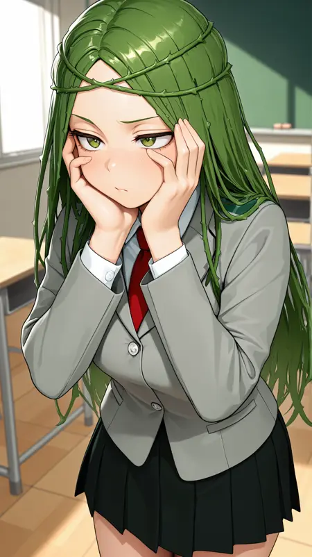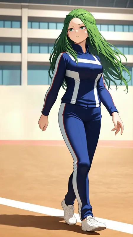 long hair, green hair, vine hair, green eyes, blue tracksuit, gsuit2,