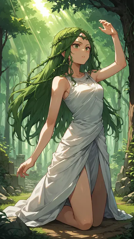 长发,绿发,藤蔓发,绿眼,白色连衣裙,白长袍,无袖