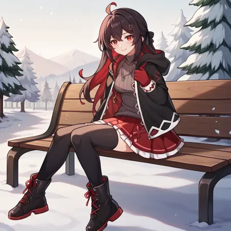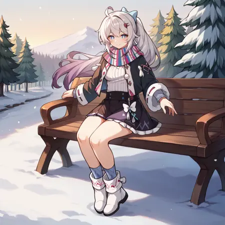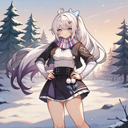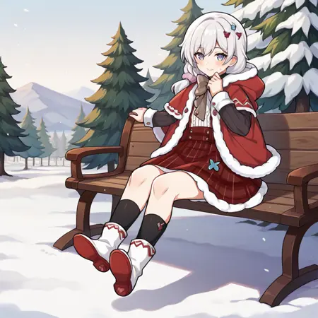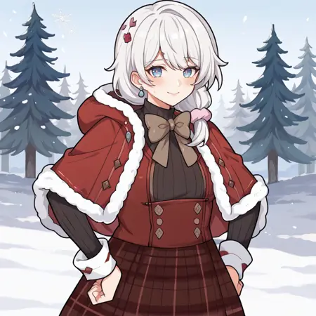 Fol002, XM_Kia, kiana kaslana, blue eyes, symbol-shaped eyes, white hair, long hair, red streaked hair, braid, fur trim, cross-laced clothes, argyle legwear, frilled sweater, pantyhose, white pantyhose, sweater, white sweater, fur-trimmed capelet, red capelet, winter hat, black headwear, alt red bow, alt hair bow, alt fur collar, alt pleated sleeves, alt white sleeves, alt long sleeves, hairclip, black gloves, alt black skirt, alt frilled skirt, alternate layered skirt, short skirt,
