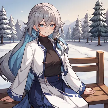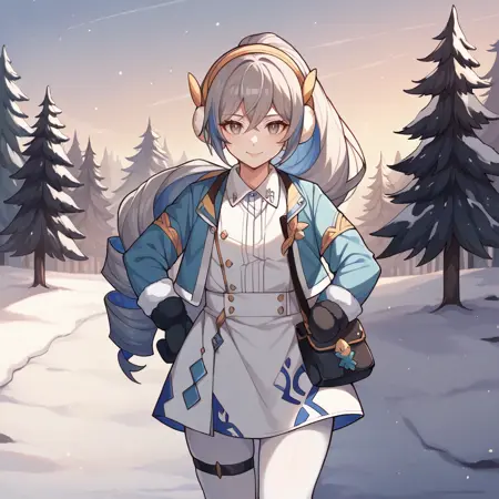 Fol002, Wt_Bronya, bronya zaychik, ロングヘア, グレイヘア, 星空ヘア, ストライプヘア, altカラードインナーヘア, ハイポニーテール, ドリルヘア, グレイアイ, 黄色い耳あて, ショートドレス, 白ドレス, カラードレス, 青ジャケット, カラードジャケット, altロングスリーブ, ブラックミトン, altファーtrimmed袖, 太ももストラップ, 白パンティーストッキング, パンティーストッキング, ショルダーバッグ,