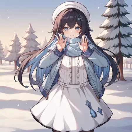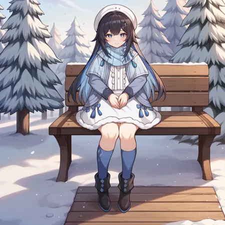 Fol003, Wt_Seele, seele vollerei, ロングヘア, 青目, ブラックヘア, カラードインナーヘア, 青髪, altスカーフ, 青スカーフ, alt白ヘアウェア, altベレー帽, 淡い青ケープレット, 青い花, altヘアクリップ, フリルシャツ, alt白シャツ, 淡い青ジャケット, ジャケット, ウィンター服, 淡い青タッセル, 淡い青袖, チュルネック, 別のロングスリーブ, ポンポン(服), ファーtrimmedスカート, 白スカート,
