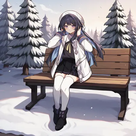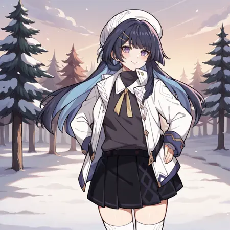 Fol001, Wt_Mei, raiden mei, ロングヘア, パープルヘア, カラードインナーヘア, 青髪, パープルアイ, 白ヘアウェア, altヘアクリップ, ベレー帽, ヘアリング, セーター下のシャツ, チュルネックセーター, ブラックシャツ, ポロシャツ, ヤンキーリボン, 首リボン, 白カラー, ウィンターコート, 白コート, オープンコート, altロングスリーブ, alt白袖, altブラックスカート, プリーツスカート, 白ハイソックス, ハイソックス,