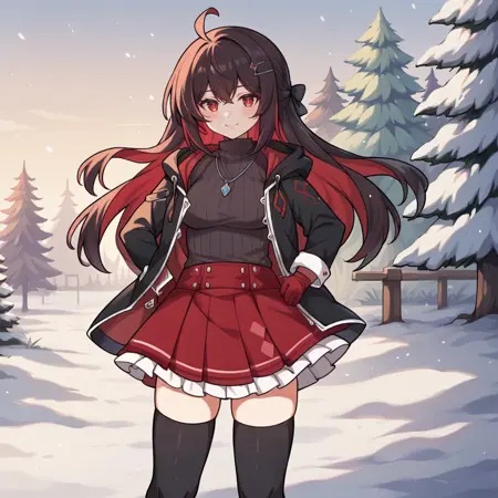 Fol003, Wt_Veliona, seele vollerei, ロングヘア, ブラックヘア, 赤目, altヘアクリップ, カラードインナーヘア, 赤髪, ahoge, ヘアリボン, ブラックリボン, ブーツ下のハイソックス, フード付きジャケット, ブラックジャケット, もう一つのロングスリーブ, 赤グローブ, ブラックハイソックス, altハイソックス, 赤スカート, プリーツスカート, フリルスカート, ネックレス, リブセーター, altチュルネックセーター, ブラックセーター, 交差リボンシューズ, ネイキーブーツ,