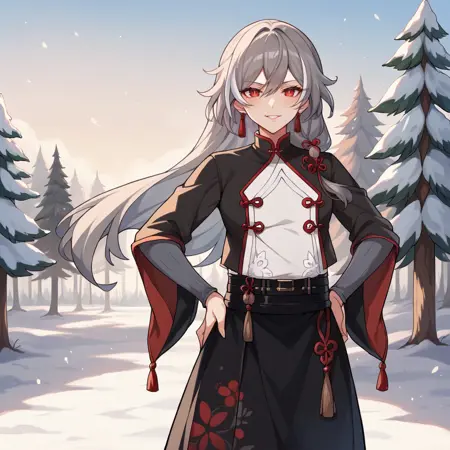 Fol004, WT_Senti, fu hua, 赤目, ローポニーテール, ロングヘア, グレイヘア, 白ストライプヘア, altサイドポニーテール, 中国風服, シャツのオーバーハング, ツートーンシャツ, altブラックシャツ, alt白シャツ, 茶タッセル, ジュエリー, フローラルプリント, ブラックベルト, グレイ袖, altブラック袖, alt層になった袖, ロングスカート, altブラックスカート,
