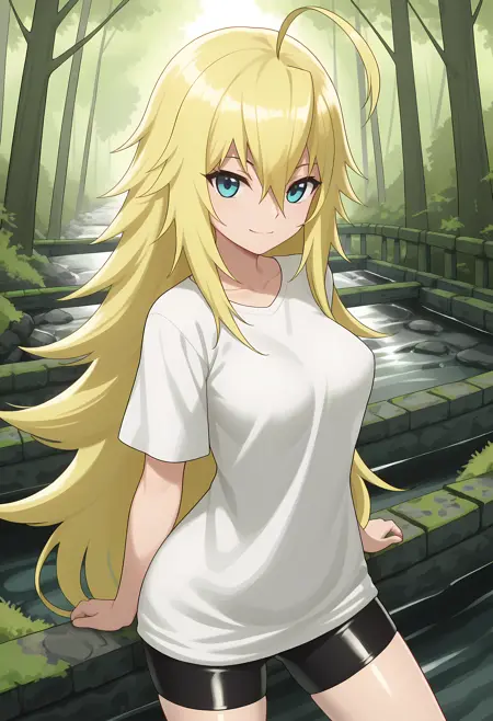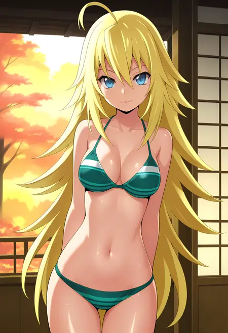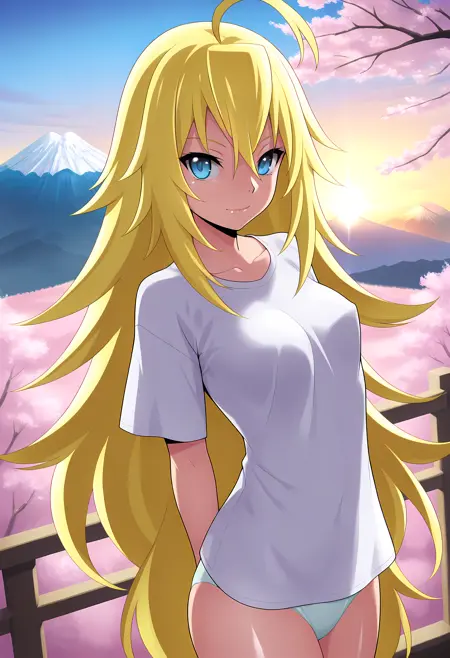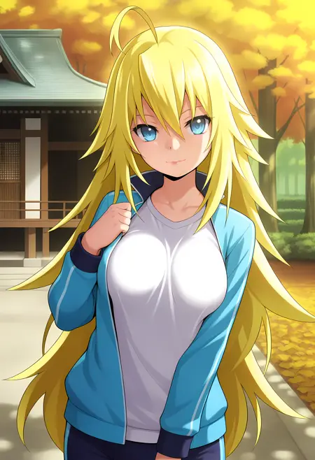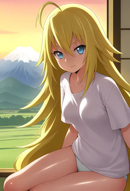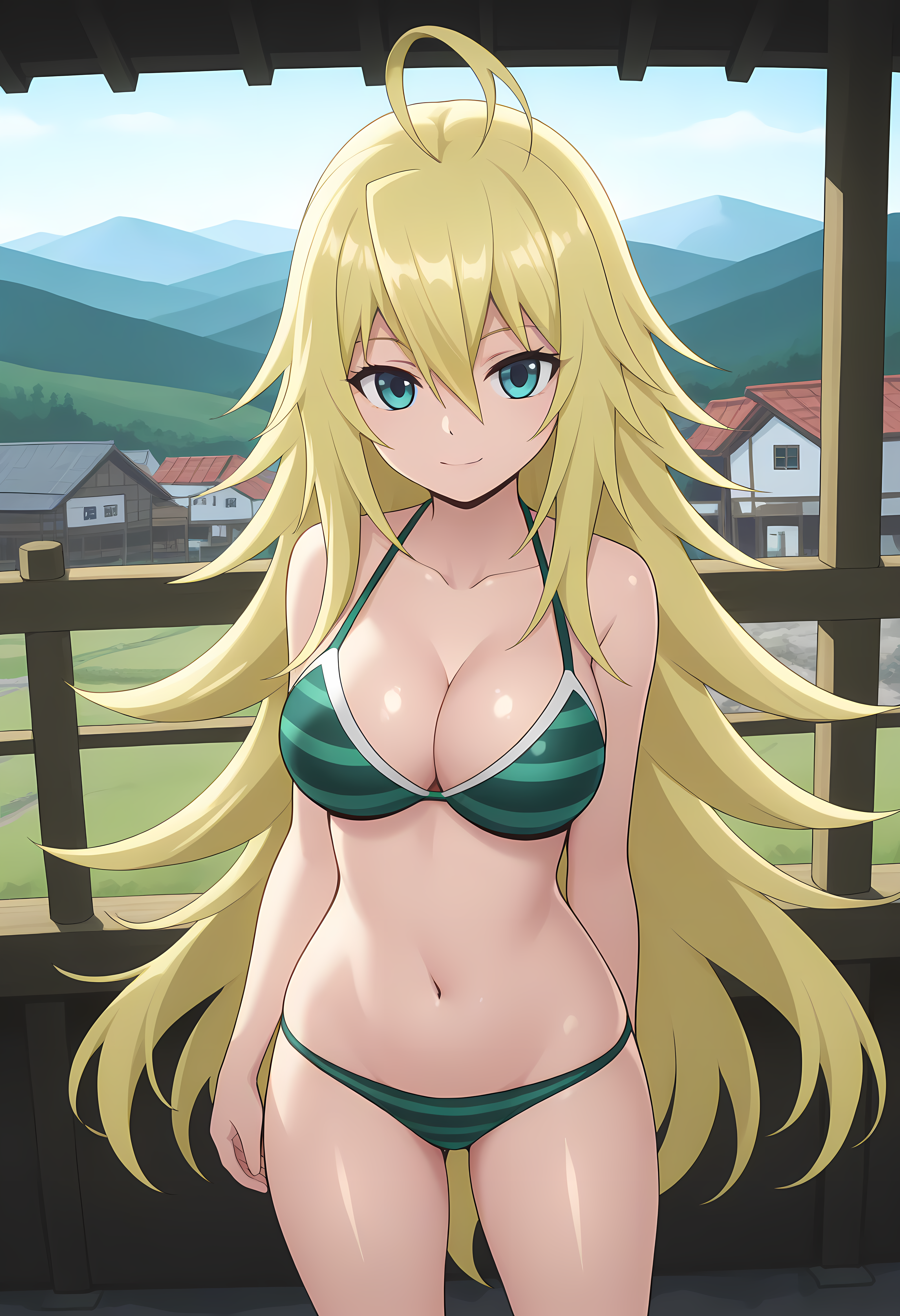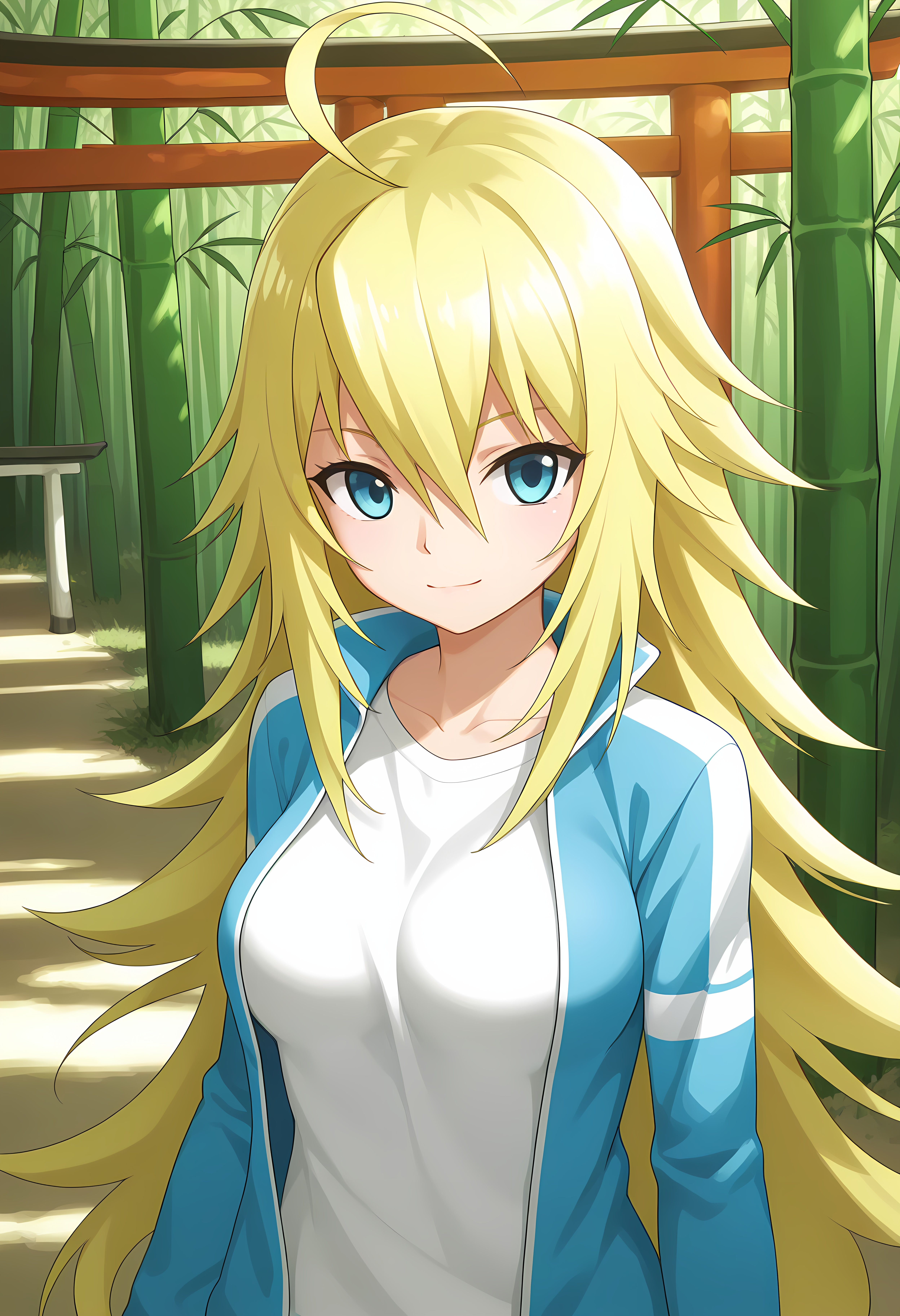 외모 → ohwx, blonde_hair, long_hair, 1girl, breasts, ahoge, blue_eyes, large_breasts, hair_between_eyes, very_long_hair,