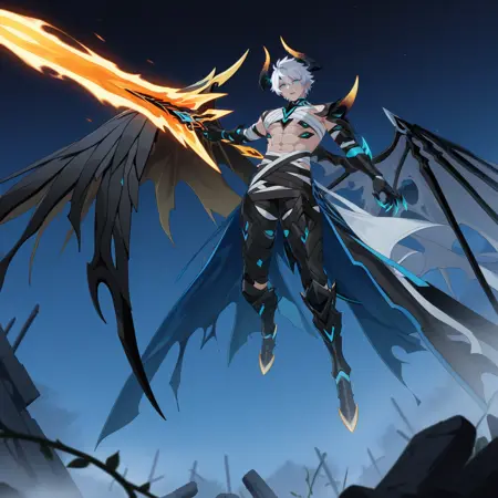 Kas_Dem, 悪魔の少年, 角, 黒い翼, 黒い爪, 肘までの手袋, 代替の黒い手袋, 短髪, 青い角, 破れた服, 代替のアーマー, 悪魔の翼, 絆創膏で巻かれた腕, 絆創膏, 代替の黒いパンツ, 代替のパンツ, 片翼,