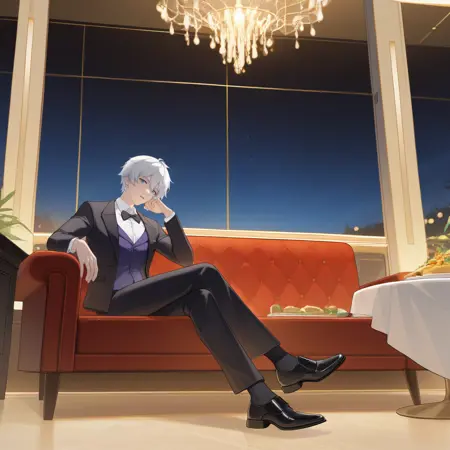 KevinHi3, Kvn_Frm, 短髪, 白髪, 青い目, 紫のベスト, ベスト, スーツ, スーツジャケット, 黒いジャケット, タキシード, ドレスシャツ, 代替の白いシャツ, 黒いネクタイ, 長袖, 代替の黒い袖, ドレスパンツ, ベスト,