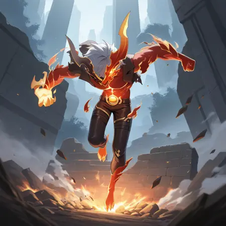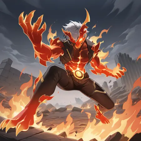 KalpasHi3, Klp_Bss, 회색 머리, 색상 피부, 빨간 피부, 노란 눈, 뿔, 빛나는 눈, 타버린 옷, 소매 없는 재킷, 찢어진 재킷, 찢어진 옷, 검은 재킷, 짧은 재킷, 검은 바지, 벨트 버클, 하네스, 빨간 갑옷, 빨간 마스크, 빨간 스파이크, 발톱,