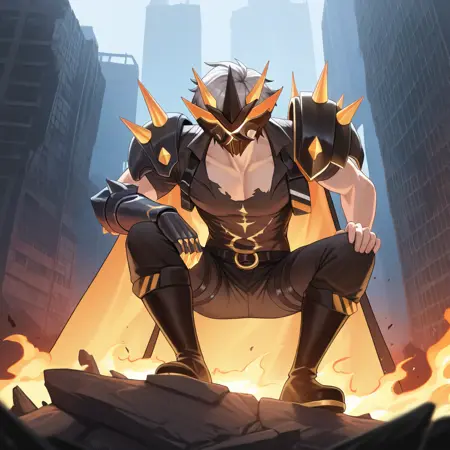 KalpasHi3, Klp_Def, 회색 머리, 검은 머리, 그라데이션 머리, 단발, 한 손 장갑, 찢어진 셔츠, 검은 셔츠, 한쪽 어깨판, 스파이크, 어깨 스파이크, 마스크, 얼굴 가림, 어깨 보호대, 짧은 소매, 검은 소매, O링, 하네스, 검은 바지, 검은 벨트, 어깨 끈, 어깨 망토, 주황색 망토, 근육질 남성,