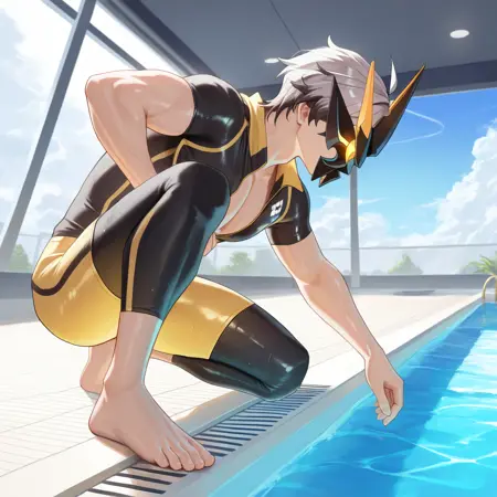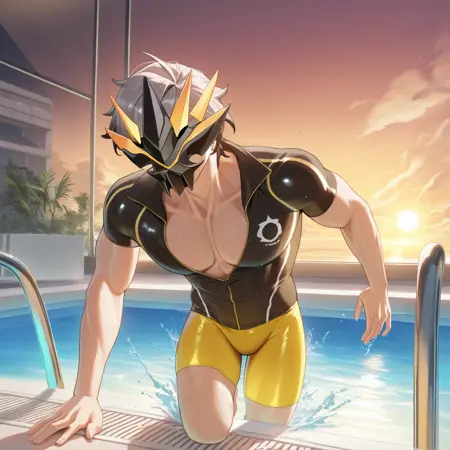 KalpasHi3, Klp_Swm, 회색 머리, 검은 머리, 그라데이션 머리, 단발, 남성 수영복, 웨트수트, 노란 수영복 반바지, 얼굴 가림, 마스크, 레깅스, 부분적으로 지퍼 열림, 수영복 반바지, 가슴 홈, 근육질 남성,