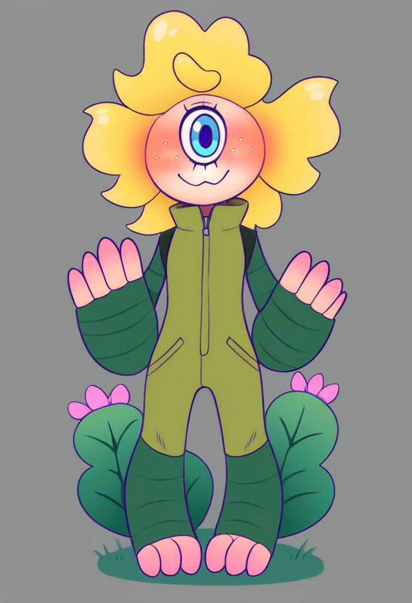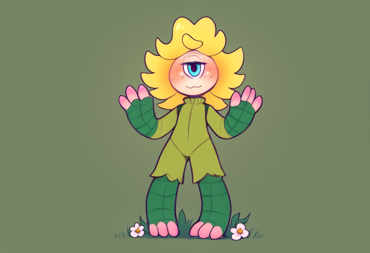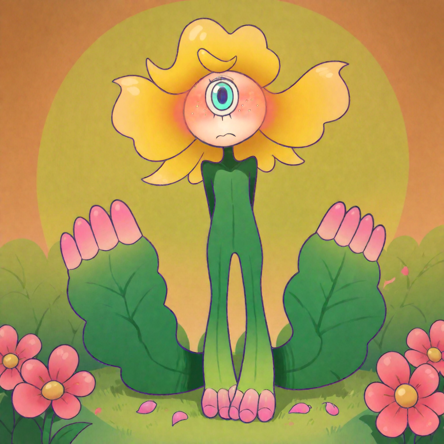 score_9, score_8_up, score_10 (vb_petals,1boy,femboy,cyclops,one eyed, eyelash, freckles, insect arms,plant monster, plant, smile,blush,yellow mane,floral,flower)flowey,