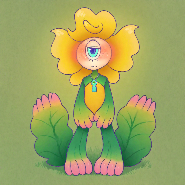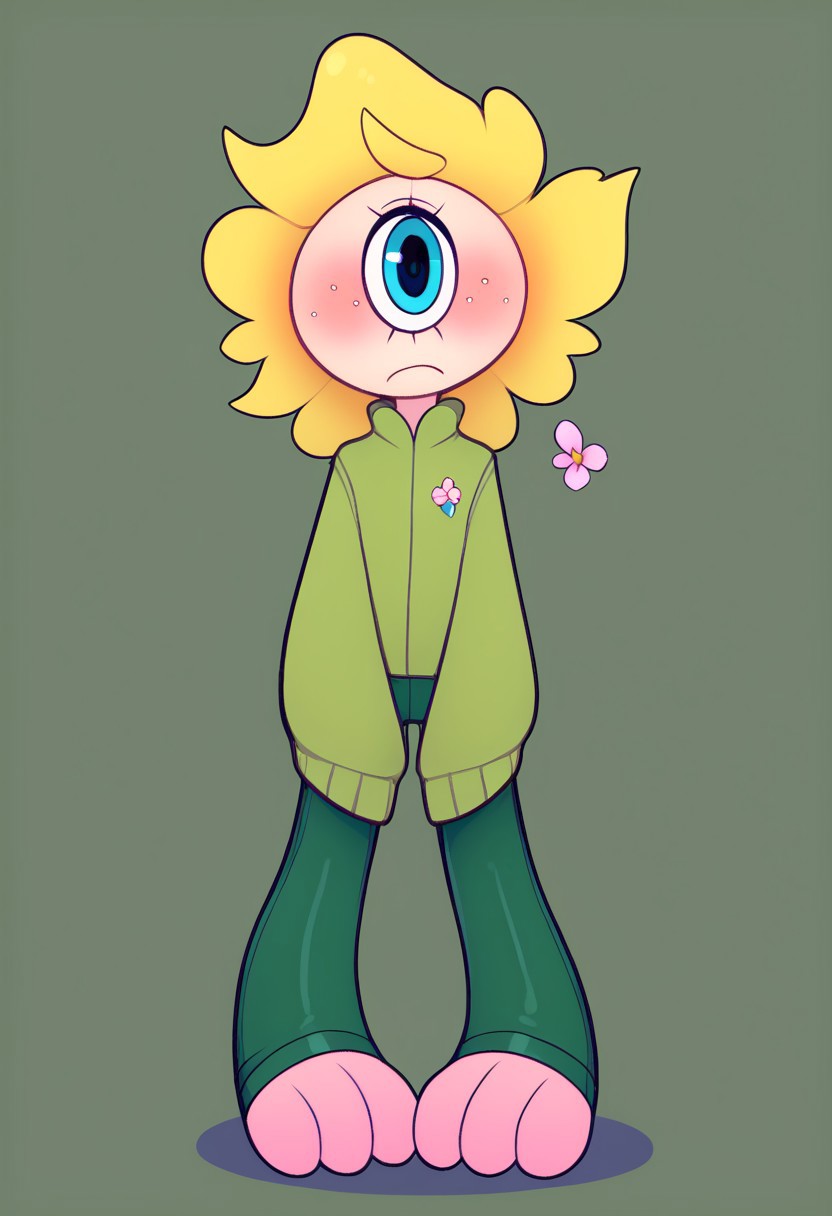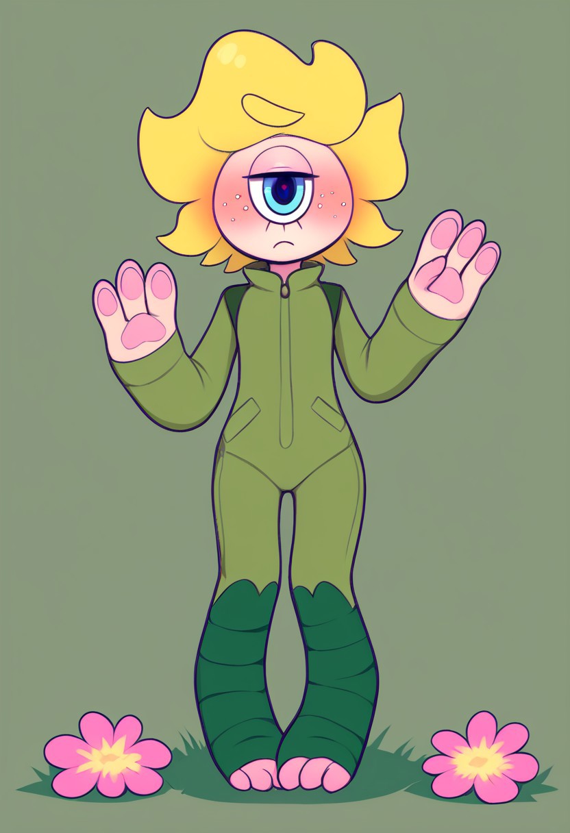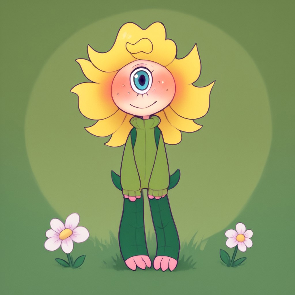 score_9, score_8_up, score_10 (vb_petals,1boy,femboy,cyclops,one eyed, eyelash, freckles, insect arms,plant monster, plant, smile,blush,yellow mane,floral,flower)flowey,