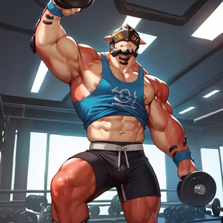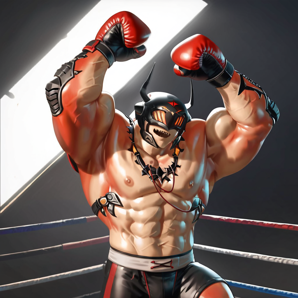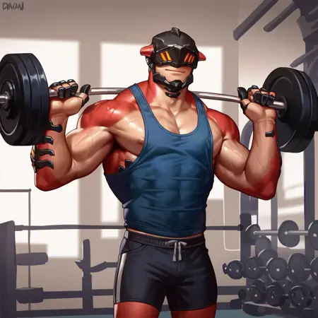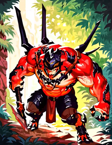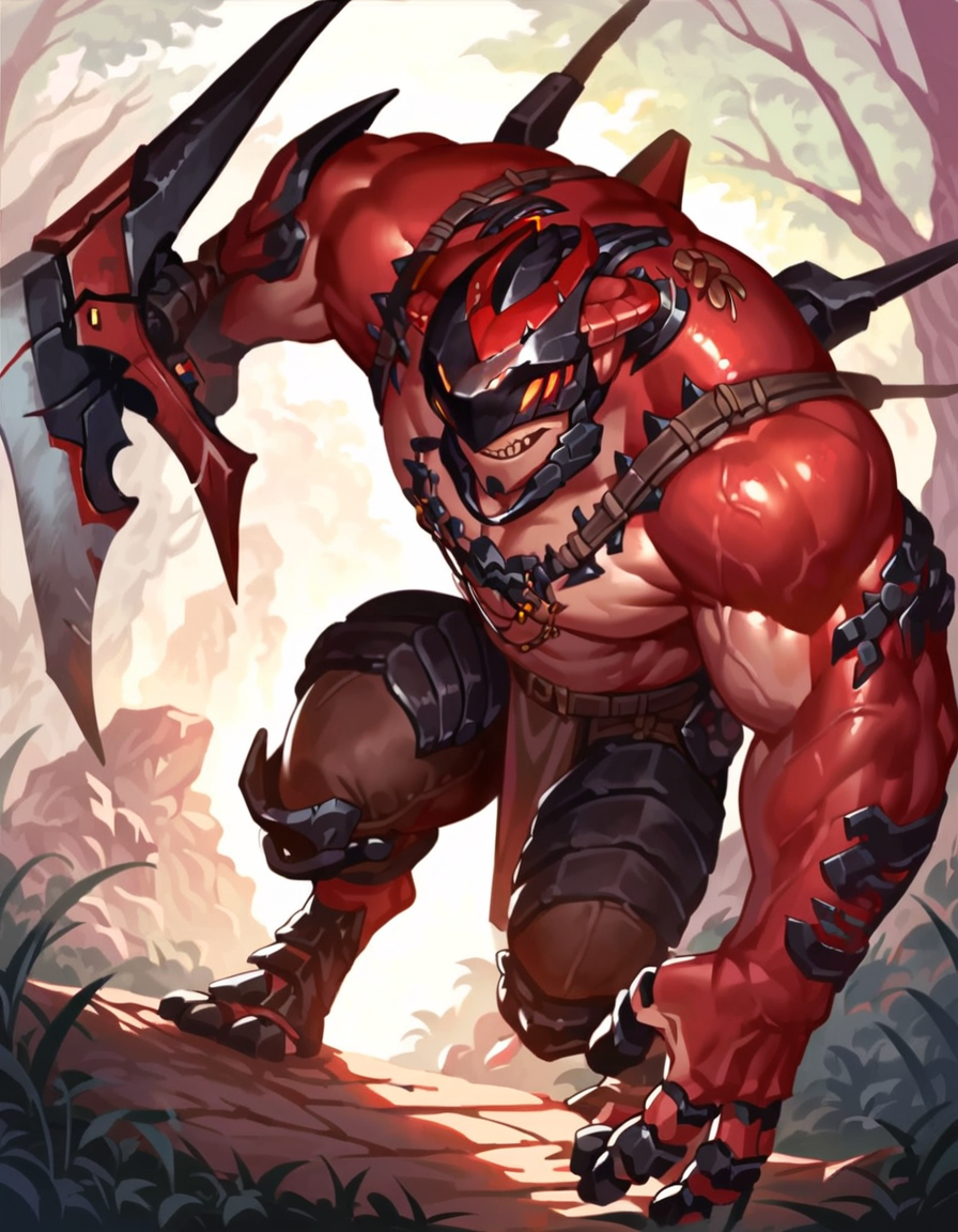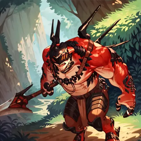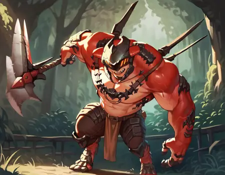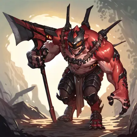 推奨プロンプト - drakahlcru, metallic helmet, orange eyes, muscular humanoid, dark red fleshy skin, holding axe weapons,