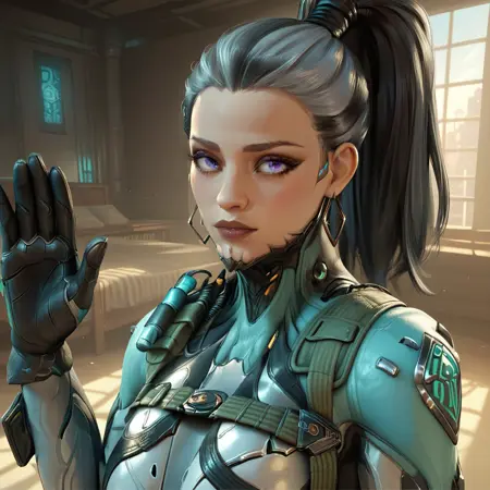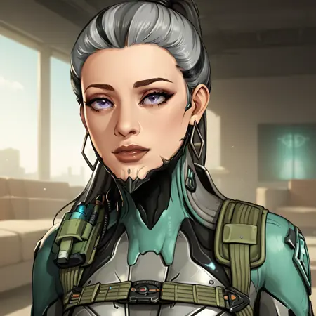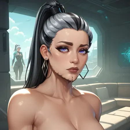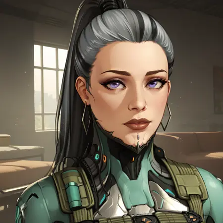Eleanor, 1girl, one mature woman, black hair, jewelry, multicolored hair, two-tone hair, piercing, ponytail, grey hair, earring, ((high quality face)), tied hair, purple eyes, bodysuite, neck armor, pants, cyborg, glove,shade,hips,