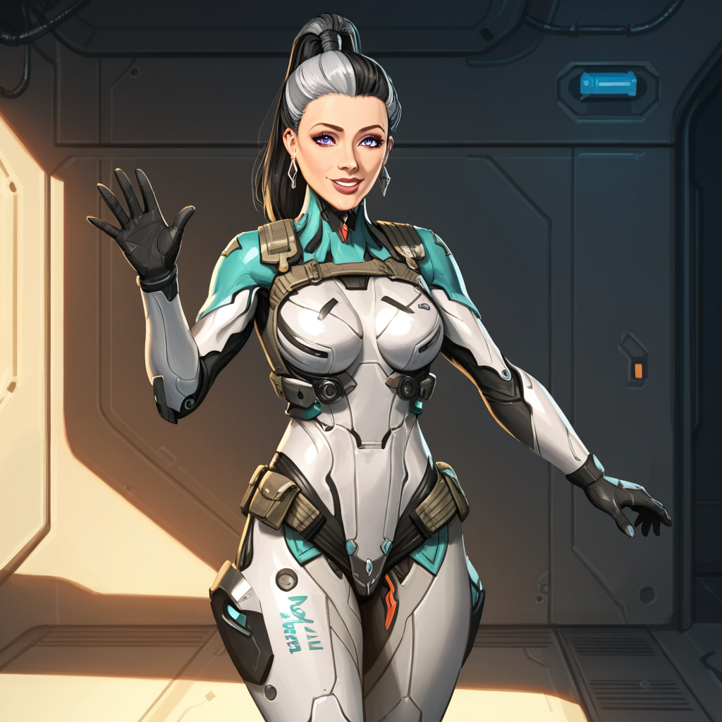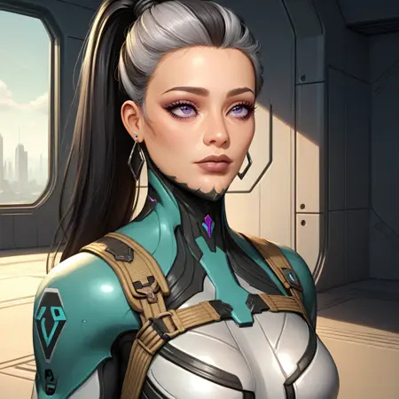 Eleanor,1女孩,一位成熟女性,黑发,珠宝,彩发,双色发,穿孔,马尾辫,灰发,耳环,((高画质面部)),扎发,紫眼,紧身衣,颈部护甲,长裤,赛博格,手套,阴影,臀部