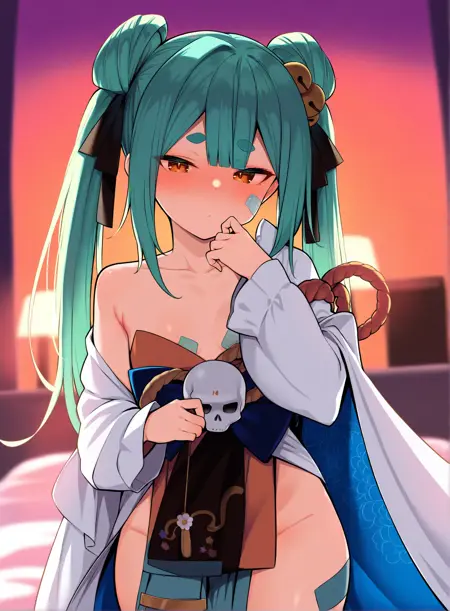 1girl, inamiyoki, green hair, japanese clothes, pelvic curtain, talisman,