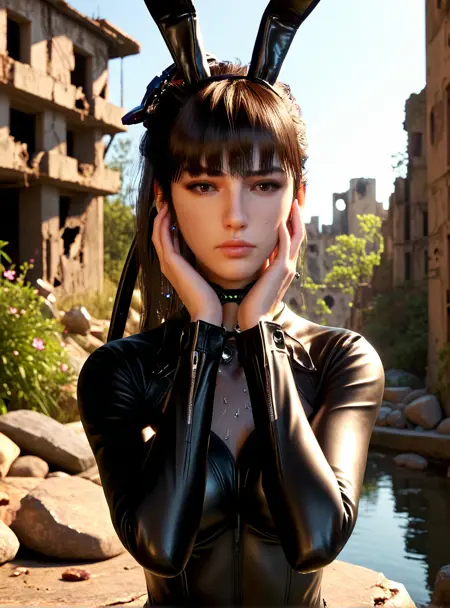 <lora:eve_07_fixed-08_NEW:0.7>, eve_07, 1girl, lips, realistic, black hair, brown eyes, long hair, jewelry, earrings, ponytail, choker, brown hair, blunt bangs, freckles, black eyes, science fiction, hair ornament,