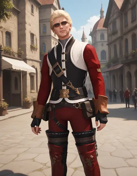 shades, red shirt, vest, belt, fingerless gloves, red pants, thigh boots