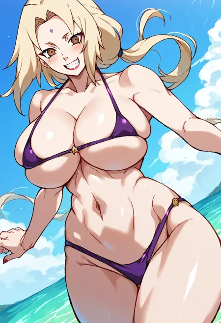tsunade (naruto),mature female,blonde hair,brown eyes,huge breasts,collarbone,cleavage,long hair,forehead mark,makeup,swimsuit,purple bikini,micro bikini,