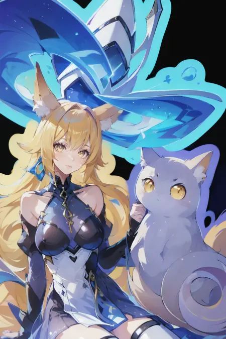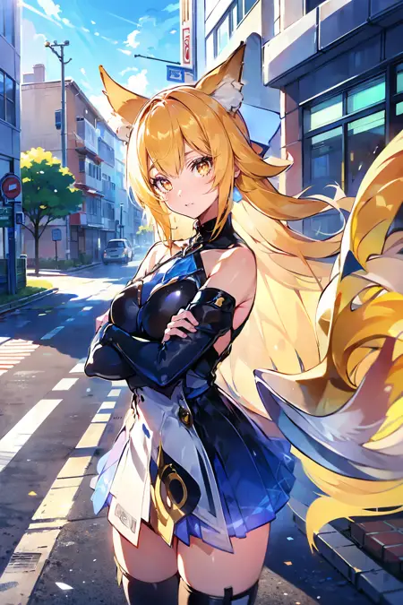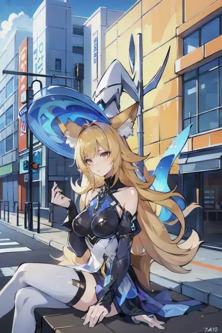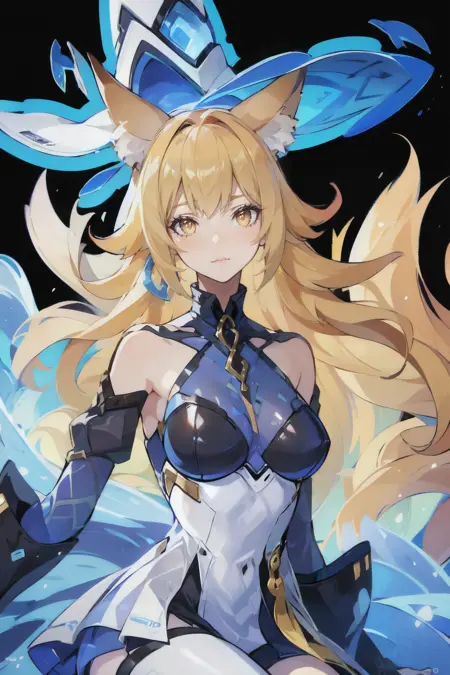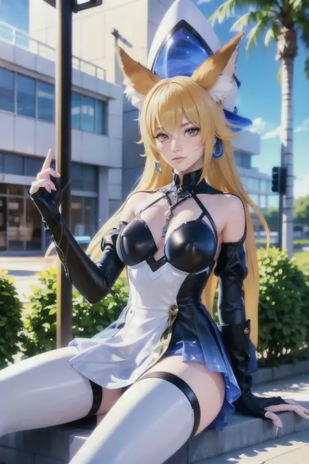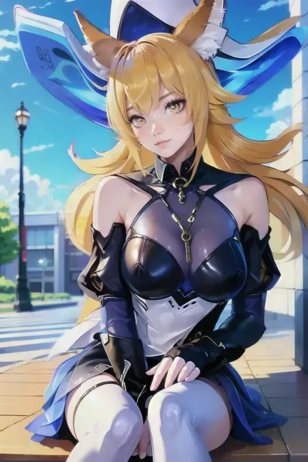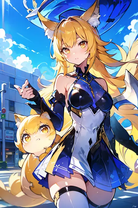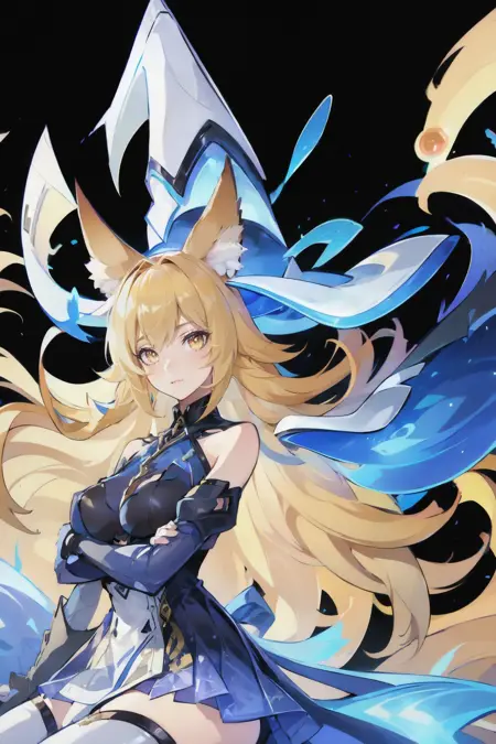 Prompt: Liliana_Witching_Hour, 1girl, solo, hat, witch hat, long hair, animal ears, fox ears, animal ear fluff, blonde hair, bangs, earrings, looking at viewer, yellow eyes, lips, closed mouth, bare shoulders, breasts, large breasts, dress, blue dress, black dress, gloves, black gloves, fingerless gloves, skirt, white skirt, thighhighs, white thighhighs, white footwear, tail, fox tail, fox girl