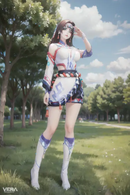プロンプト: Veres_The_Poet, 1girl, solo, long hair, brown hair, jewelry, headband, earrings, looking at viewer, green eyes, lips, parted lips, breasts, large breasts, japanese clothes, rope, tassel, shimenawa, skirt, legs, thigh strap, boots, knee boots, high heels, white footwear, jewelry
