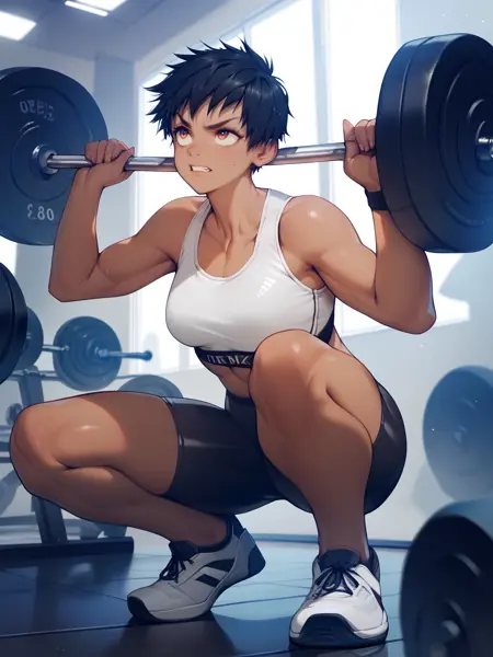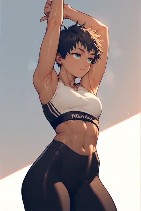 opmsuiko,短发,黑发,蓝眼睛,嘴下有痣,深色皮肤,假小子风格,连帽衫,衣着敞开,运动文胸,紧身裤