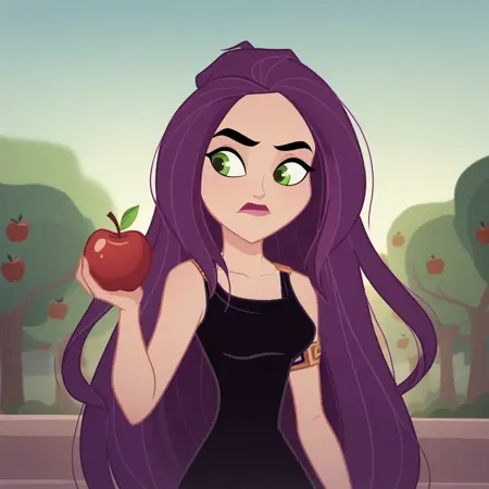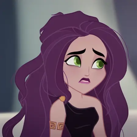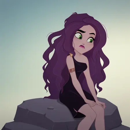 Eris, 1girl, solo, purple hair, green eyes, long hair,