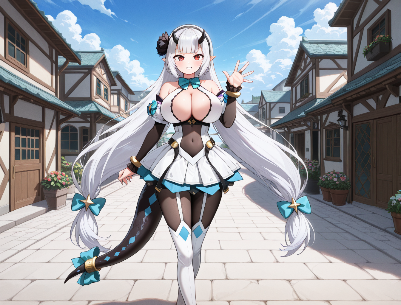| 训练词汇 | Epic7_Yufine, low-tied_long_hair, long_hair, tail_ornament, tail, tail_ring, horns, black_horns, large_breasts, very_long_hair, red_eyes, bangs, white_hair, dragon_tail, dragon_girl, blunt_bangs, twintails, sidelocks, pointy_ears, low_twintails, v-shaped_eyebrows, fingernails, red_nails, covered_navel, bow, star_hair_ornament, blue_bow, hair_ornament, tail_bow, detached_sleeves, bare_shoulders, cleavage, hair_bow, bowtie, boots, pantyhose, nail_polish, hairband, jewelry, bracelet, skirt, sleeveless, white_footwear, dress, thigh_boots, flower, white_dress, garter_straps, chain, hair_flower, black_hairband, blue_bowtie, white_thighhighs, bodystocking, long_sleeves, sleeveless_dress, pleated_skirt, gold_trim, white_skirt, rose, halterneck, black_footwear, aqua_bow, high_heels, blue_skirt, ribbon, underbust, puffy_sleeves, short_dress, watson_cross, tail_ribbon, miniskirt, leotard, black_pantyhose, bridal_gauntlets, depth_of_field已复制! |