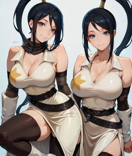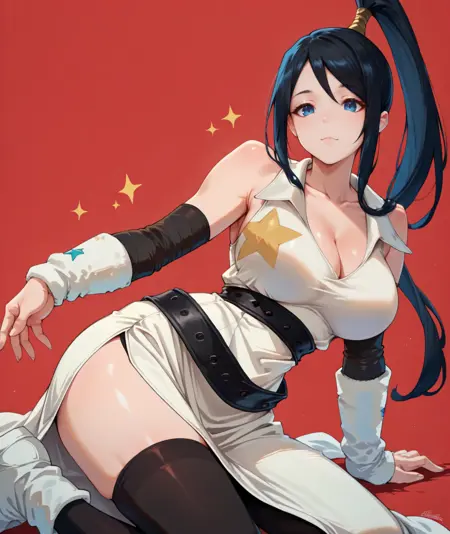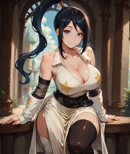 - mltsubase, 검은 머리, 높은 단발머리, 파란 눈, 칼라가 있는 드레스, 검은 벨트, 팔 보호대, 긴 머리, 별(기호), 소매 없음, 어깨 노출, 검은 스타킹, 흰 신발, 흰 드레스, 흰 팔 보호대, 허벅지 길이 양말