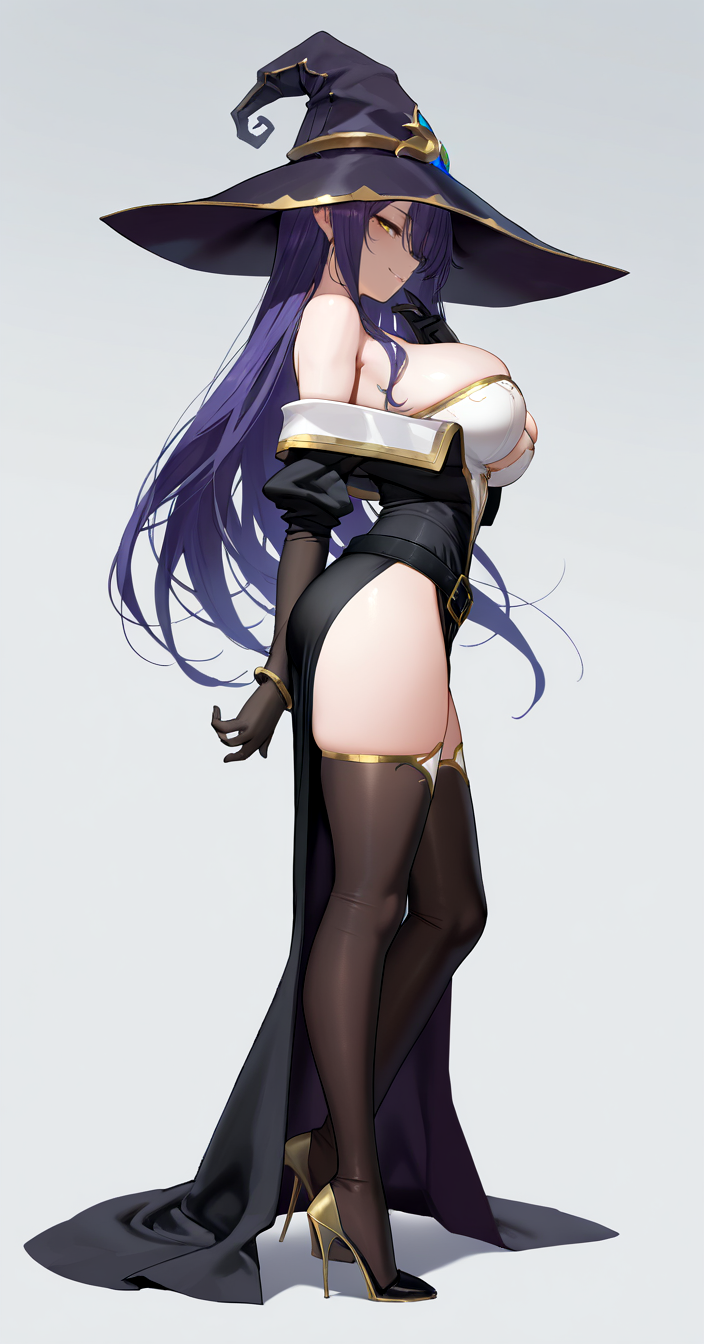服装:黑色腰带,黑色连衣裙,黑色手套,露肩裙,高跟鞋,长袖,侧开衩,女巫帽,金色镶边,金色镶边长筒袜,无肩带,手镯,白色胸衣