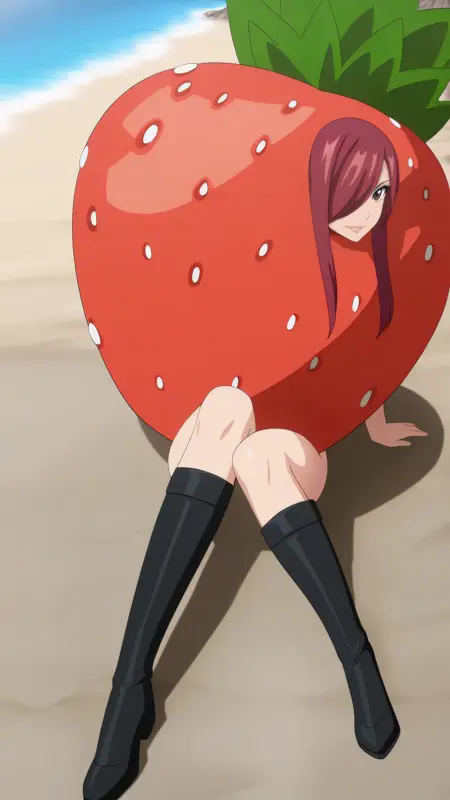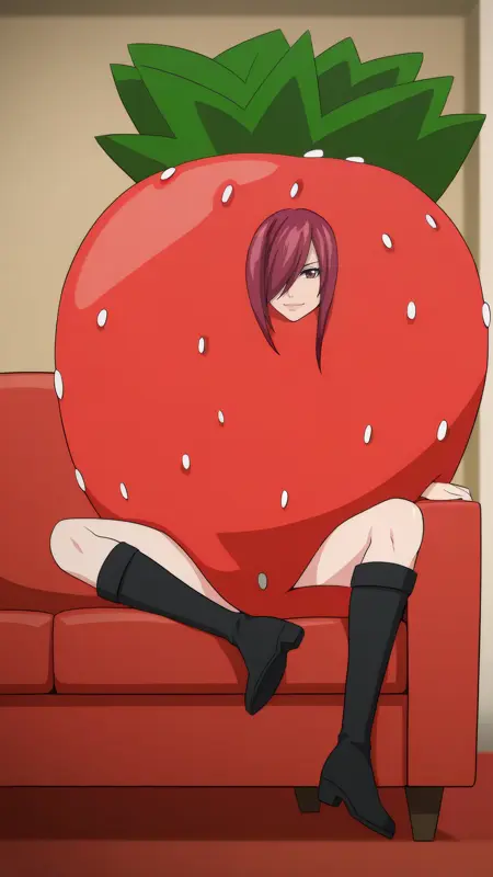 erz_strawberry, brown eyes, red hair, long hair, hair over one eye, alternate costume, mascot costume, strawberry, oversized fruit, black footwear, knee boots,