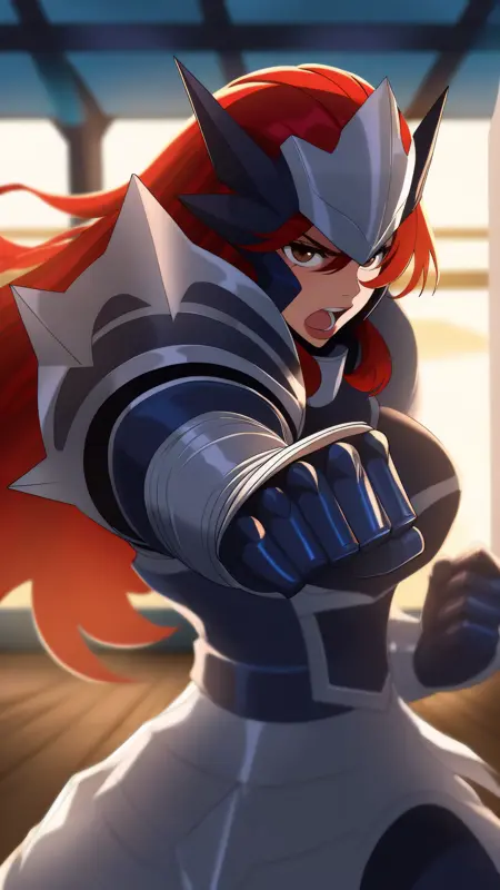 erz_lightning, 茶色の目, 赤髪, 長髪, 編んだポニーテール, 髪飾り, 黄色のヘアバンド, 髪飾り, 髪リボン, タトゥー, アーマー, 単一編み, ポールドロン, アーマードレス, 黒い太ももまで丈の靴下, ブレストプレート, ガンネル, アーマードブーツ, ショルダーパッド, ショルダースパイク,