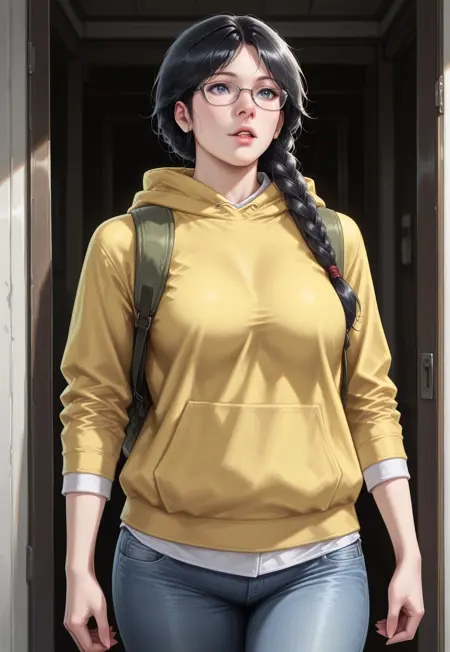 めがね、黄色のフーディー、フードを下げた状態、バックパック、デニムジーンズ、スニーカー