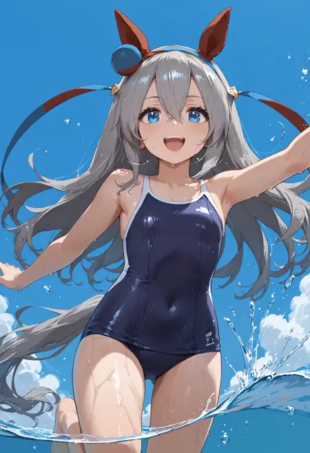 UMATC,horse ears,ear covers,horse tail,grey hair,long hair,hair ribbon,hair between eyes,blue eyes,hair ornament,hairband
