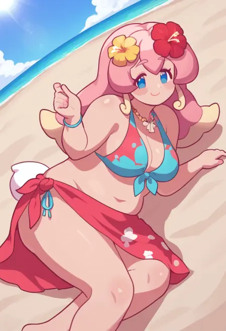 summ3r0utf1t, 긴 헤어, 이톤 헤어, 헤어 꽃, 빨간 꽃, 노란 꽃, 히비스커스, 조개 목걸이, 보석, 멀티컬러 비키니, 프론트 타이 비키니 상의, 파란 비키니, 빨간 비키니, 사롱, 짧은 꼬리, 통통한, 배꼽