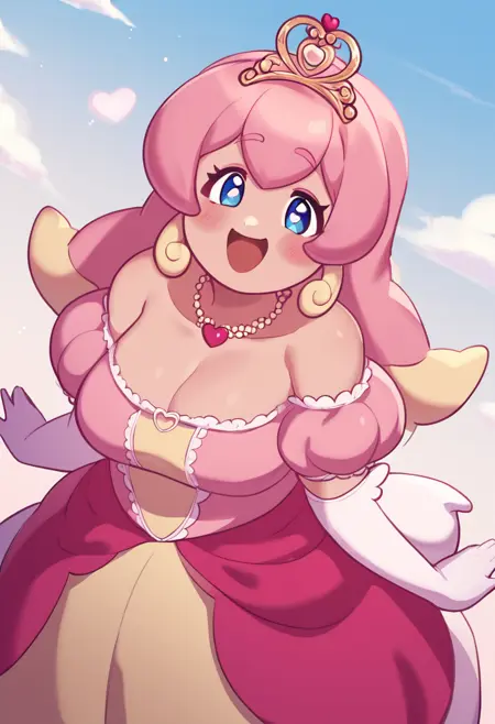 pr1nc3ssoutf1t, 긴 헤어, 왕관, 보석, 하트 목걸이, 핑크 드레스, 프릴, 젖힌 부분, 팔꿈치 장갑, 흰색 장갑, 오프숄더, 짧은 소매, 퍼프 소매, 옐로우 드레스, 짧은 꼬리, 하이힐, 빨간 신발