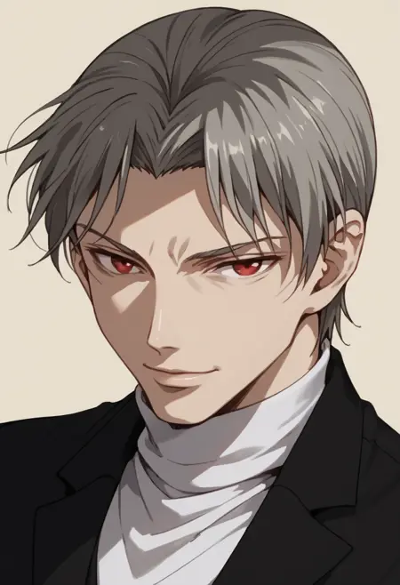 K_REIJI,gray hair,red eyes,suit,turtleneck,male focus