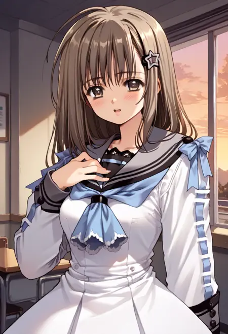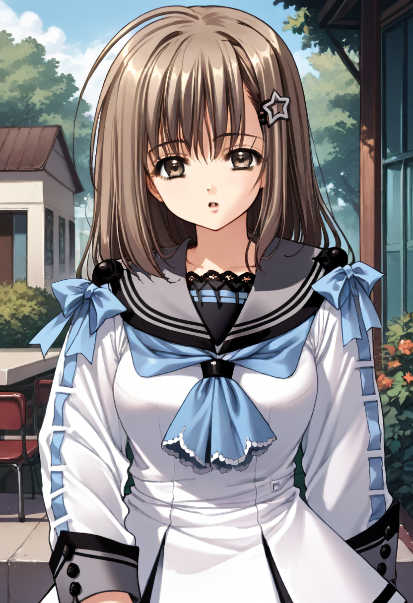 school uniform, hair ornament, long sleeves, star hair ornament, bow, ribbon, serafuku,white skirt