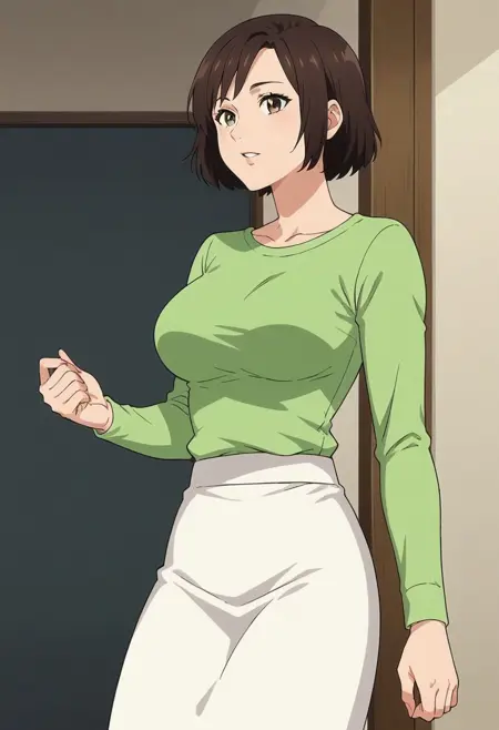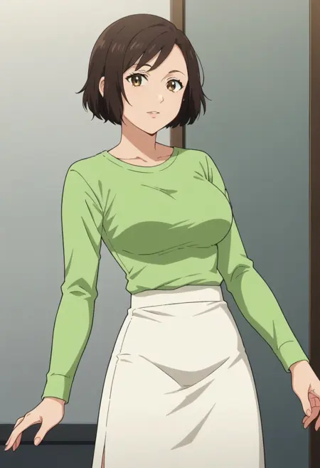 衣装:シャツ、長袖、スカート、ズボン、緑の長袖、緑のシャツ、黒のズボン、白のスカート、