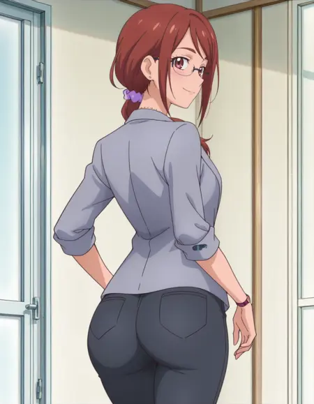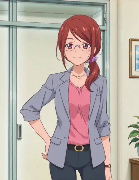 score_9, score_8_up, score_7_up, 动画截图, 单人, 1女孩, nonosumire, 眼镜, 饰品, 项链, 裤子, 夹克, 紫色发圈, 半框眼镜, 手表, lora:nonosumire:0.8